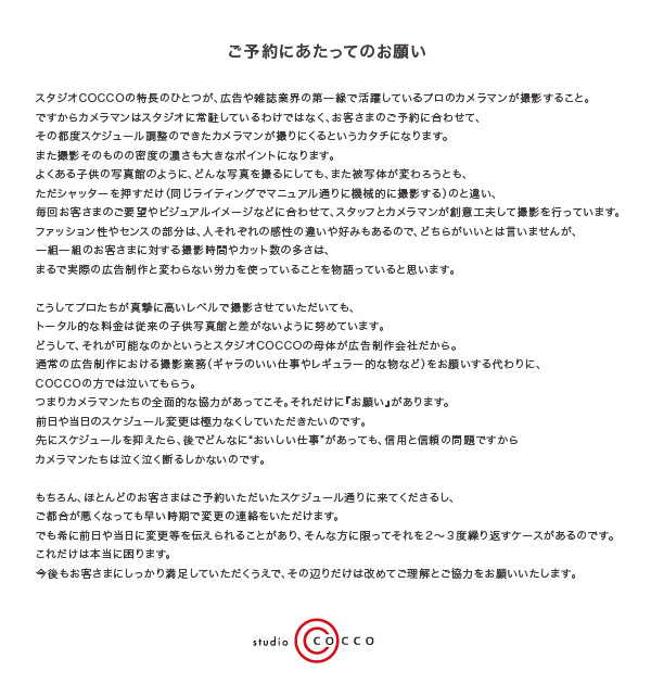 あえて衣装は用意していません。その理由は、COCCOならではの作品(写真)に対するこだわりがあるから。以下の3つの中から、ベストなチョイスをお願いします。